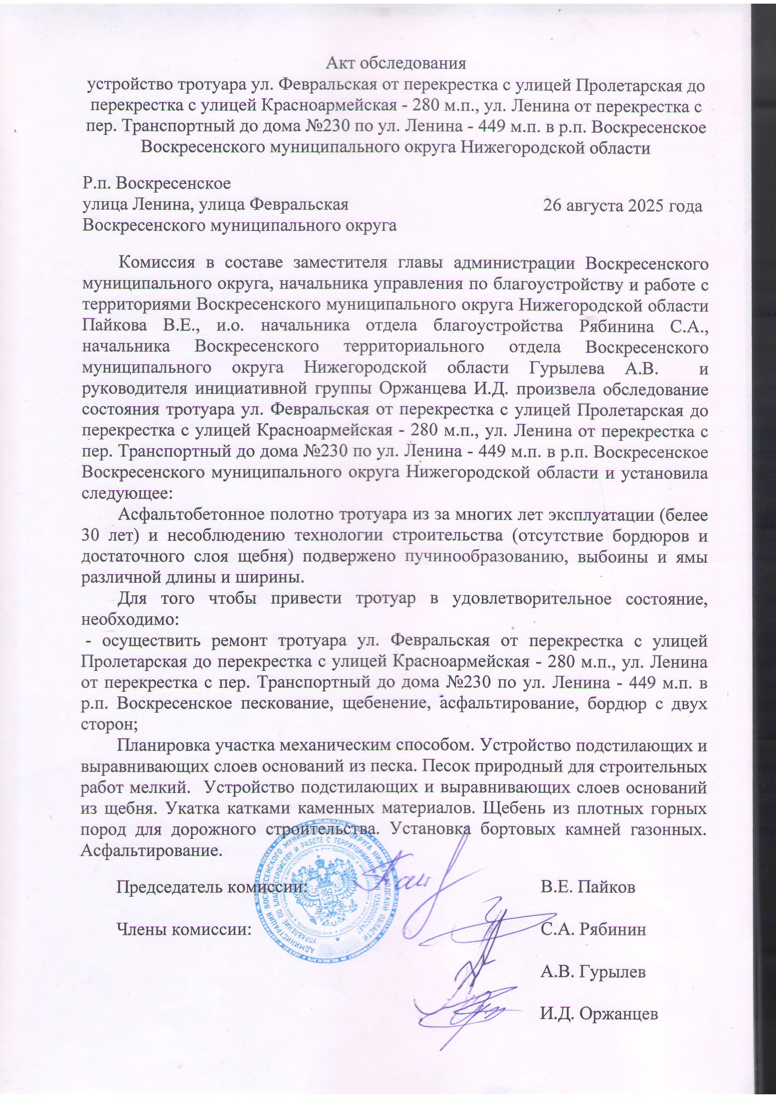 Устройство тротуара ул.Февральская от перекрестка с улицей Пролетарская до перекрестка с улицей Красноармейская - 280 м.п., ул.Ленина от перекрестка с пер.Транспортный до дома №230 по ул.Ленина - 449 м.п. в р.п.Воскресенское Воскресенского муниципального округа Нижегородской области